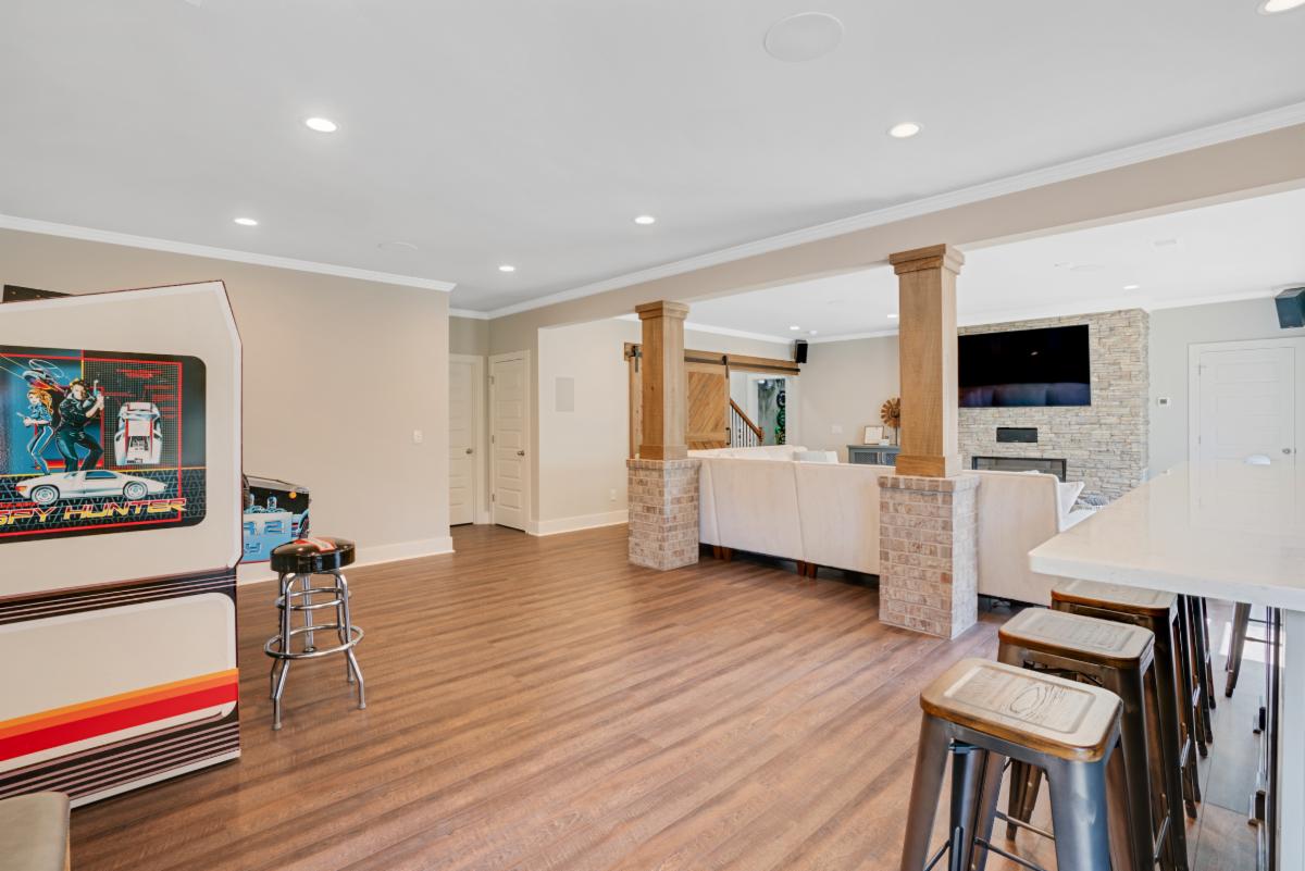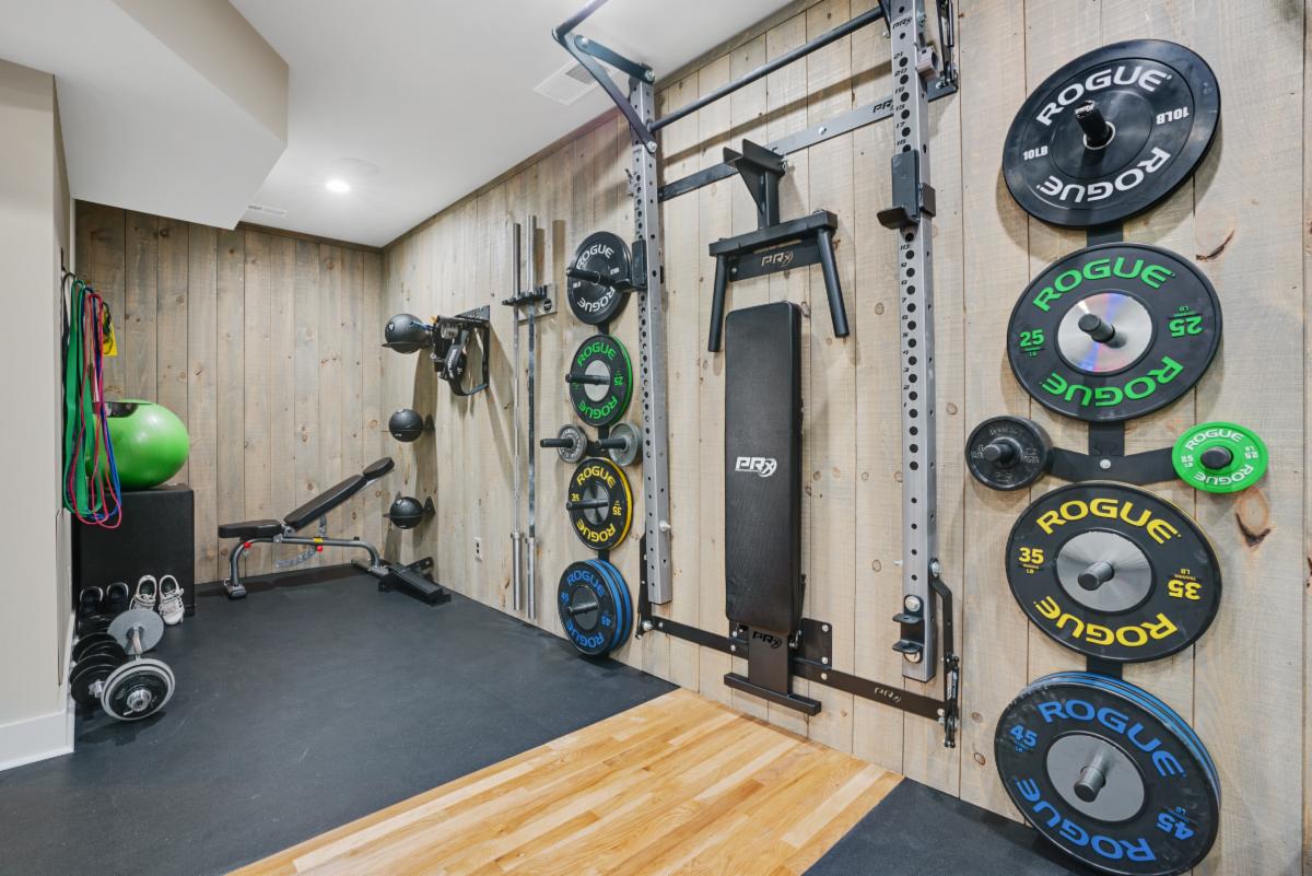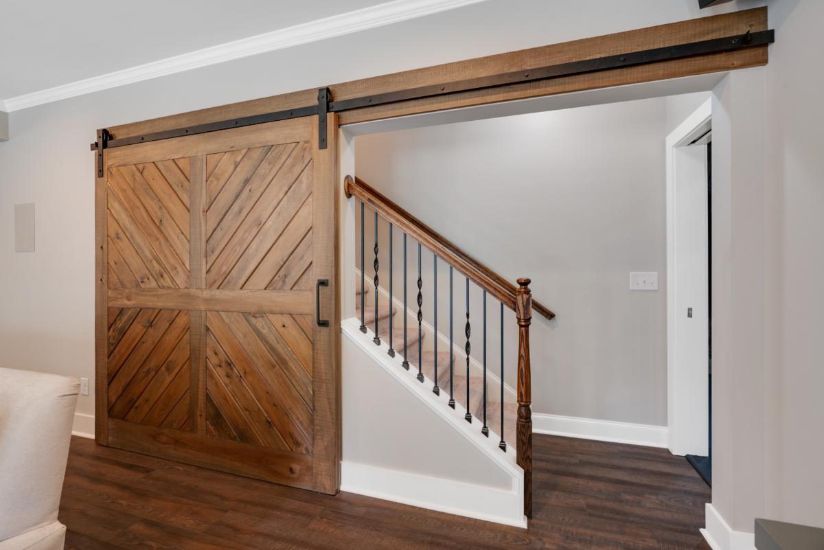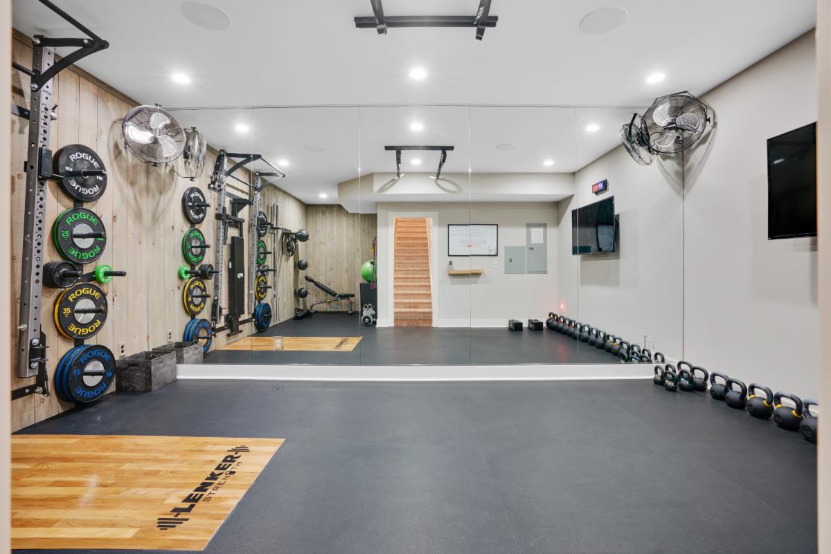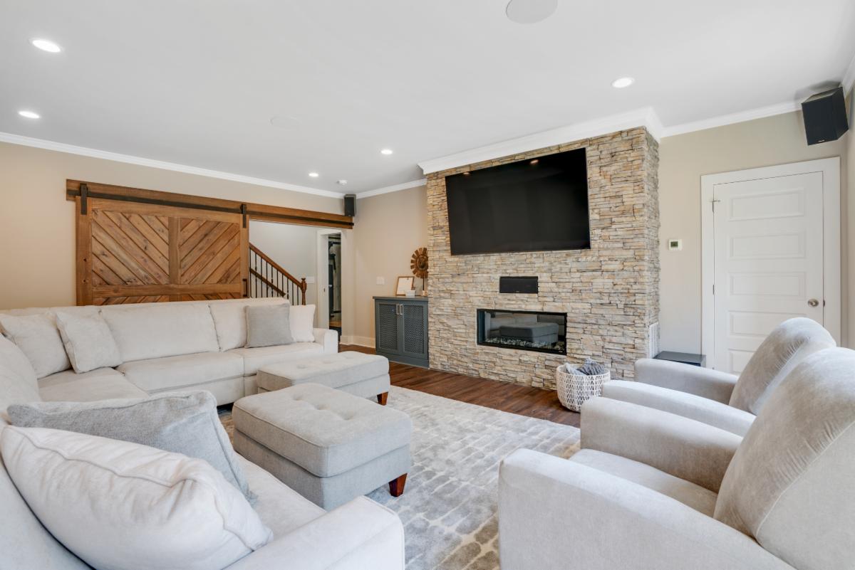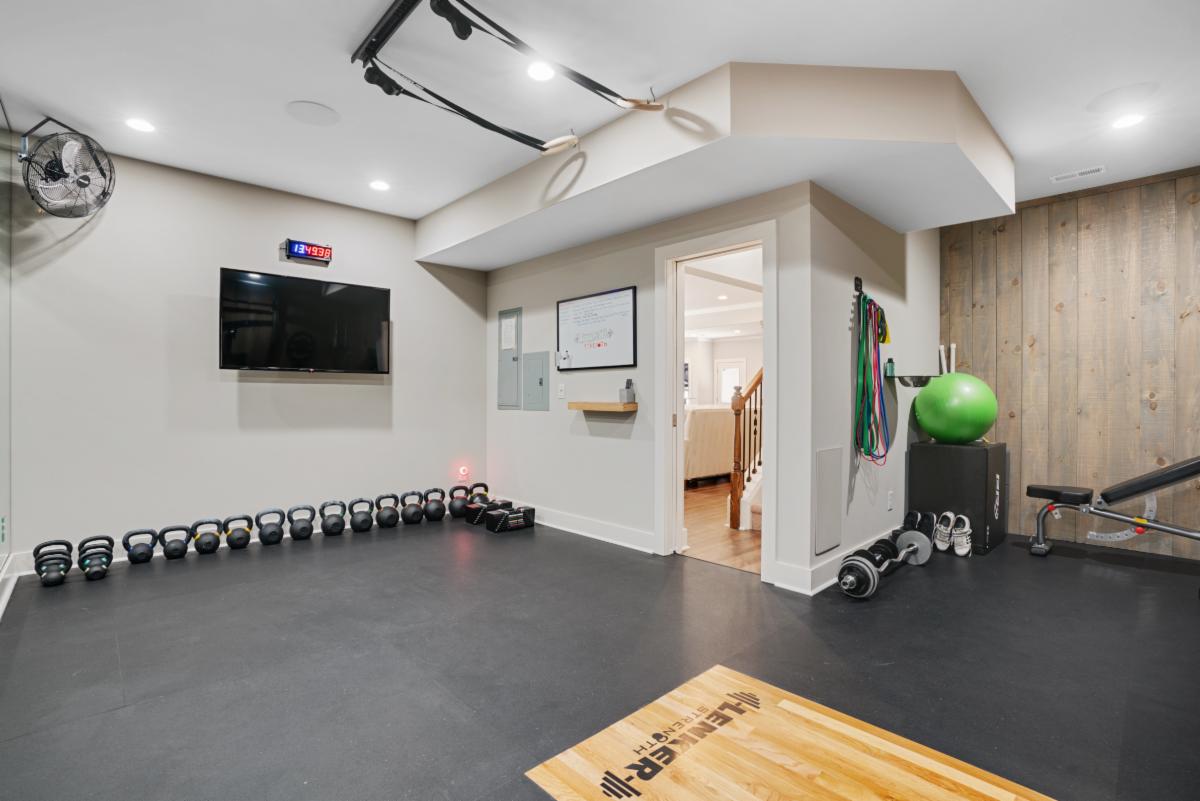 Our latest basement project was finished for a family that loves the gym in Milton, Ga. The family room featured an electric fireplace with stone surround. Load bearing walls were removed to create a more open floor plan and cedar columns with brick were then installed to delineate the different areas. A galley style bar was incorporated into the design featuring quartz counter tops, glass back splash tile, ice maker and beverage cooler. A large picture window was added into this bar area to provide additional light. A full CrossFit gym featuring decorative and resilient barn wood walls along with rubber flooring was constructed. The bathroom featured a steam shower with the ability to add essential oils for a spa like experience after workouts. The stairwell wall was opened and a handrail with metal balusters was added. We then installed a custom sliding 10 foot barn door to block noise travel between floors when entertaining. LVP flooring was installed throughout the space as a durable and functional product for the family. If you are interested in what creative ideas Victoria Renovations can develop for your home please call our sales team at 770 406 8909.