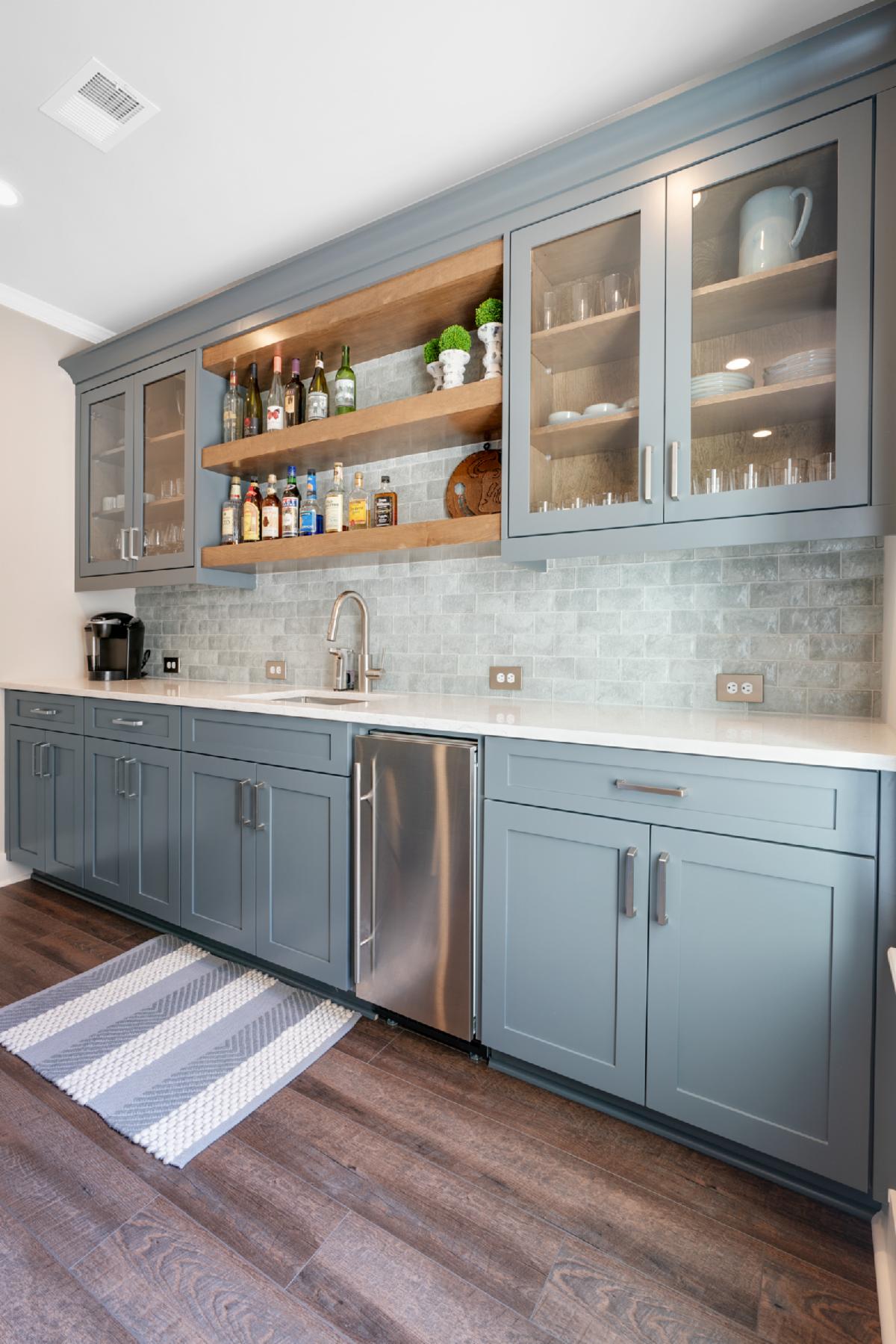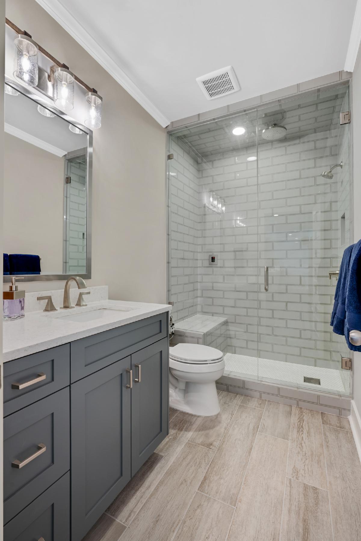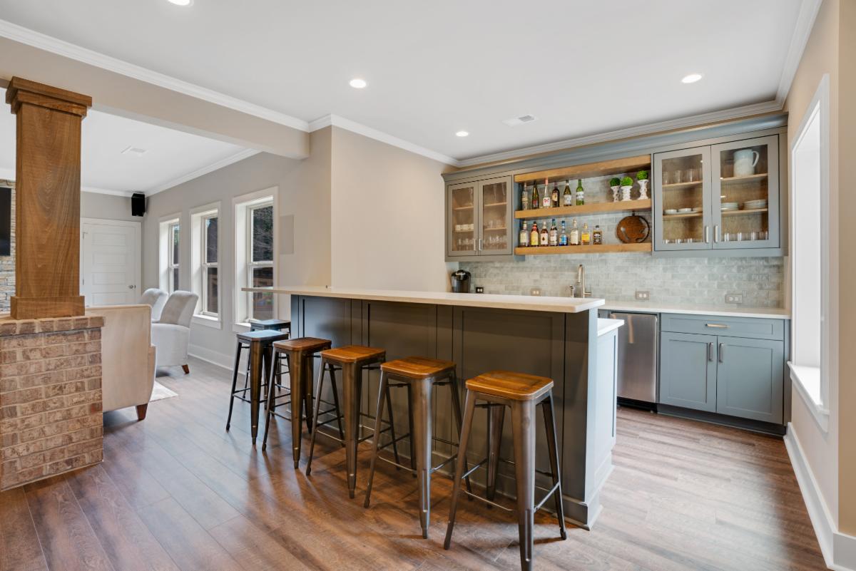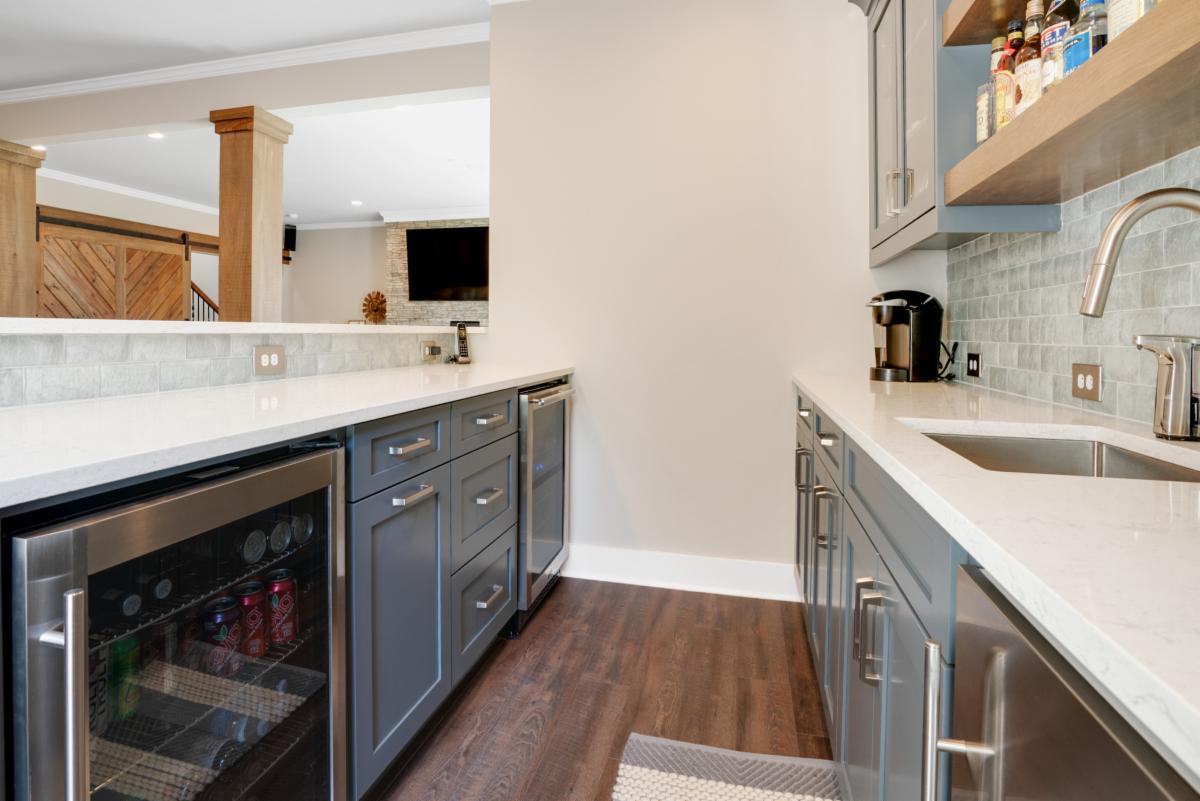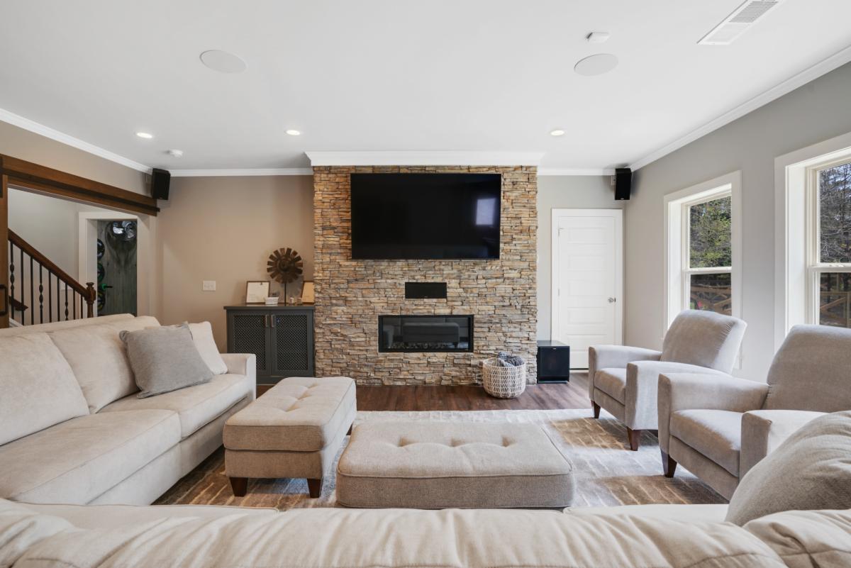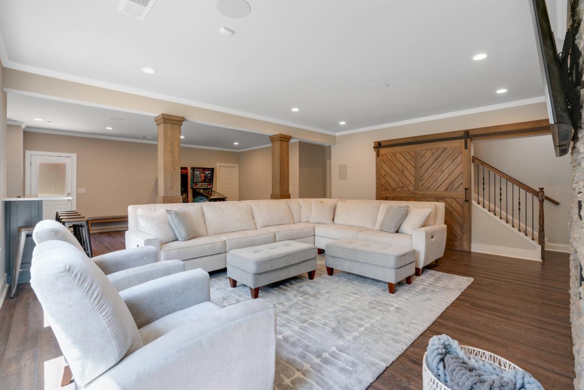 Our latest basement project was finished for a family that loves the gym in Milton, Ga. The family room featured an electric fireplace with stone surround. Load bearing walls were removed to create a more open floor plan and cedar columns with brick were then installed to delineate the different areas. A galley style bar was incorporated into the design featuring quartz counter tops, glass back splash tile, ice maker and beverage cooler. A large picture window was added into this bar area to provide additional light. A full CrossFit gym featuring decorative and resilient barn wood walls along with rubber flooring was constructed. The bathroom featured a steam shower with the ability to add essential oils for a spa like experience after workouts. The stairwell wall was opened and a handrail with metal balusters was added. We then installed a custom sliding 10 foot barn door to block noise travel between floors when entertaining. LVP flooring was installed throughout the space as a durable and functional product for the family. If you are interested in what creative ideas Victoria Renovations can develop for your home please call our sales team at 770 406 8909.