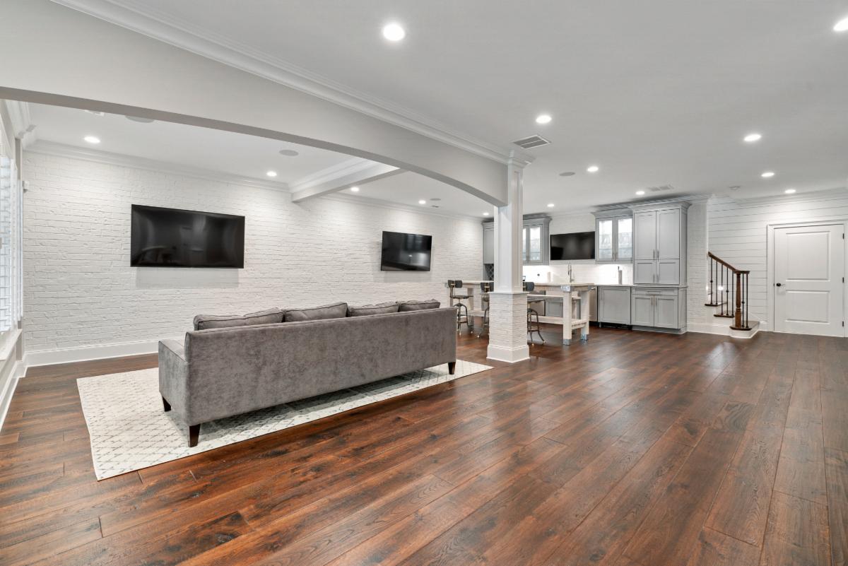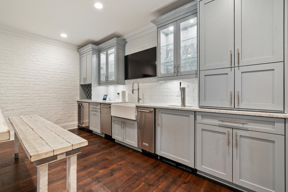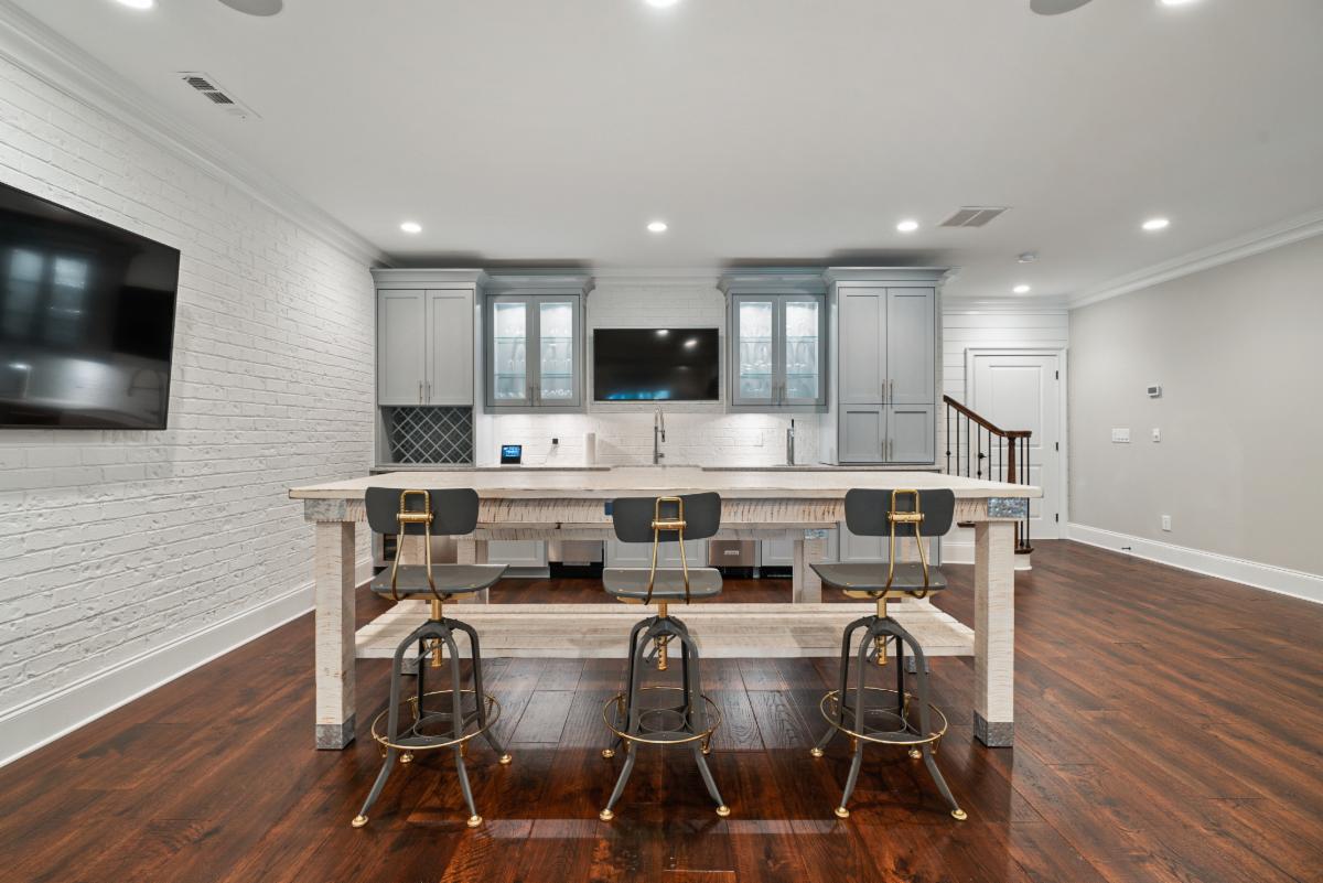 This featured basement renovation was built for a family in Marietta, Georgia. With over 2000 ft.² of space to work with and a request from the family to create an open floor plan, we engaged our engineer to specify beams that we would install to remove four load bearing walls creating a more open floor plan. Thin brick was installed on the walls of the main entertainment area and was painted white to create a fresh and spacious feel. A wet bar area was built including a beverage cooler, wine cooler, ice maker and dishwasher. We also custom built a rustic 8 foot wide barn door that would create a “flex” room that is currently used as a kids game room but could be used as a bedroom in the future. The large barn door allows it to keep the room feeling connected with the rest of the basement when open or provides privacy when used as a bedroom. A powder room was constructed with shiplap paneling and quartz countertops . Surround sound throughout and several TVs make it the perfect environment for entertaining and and spending time with family.