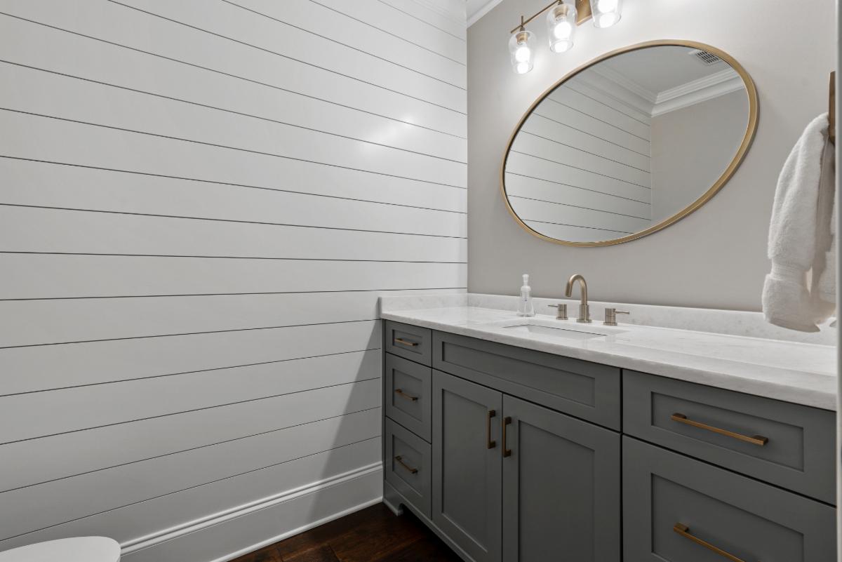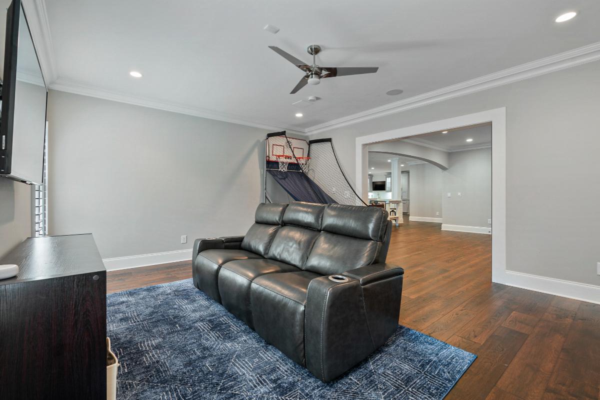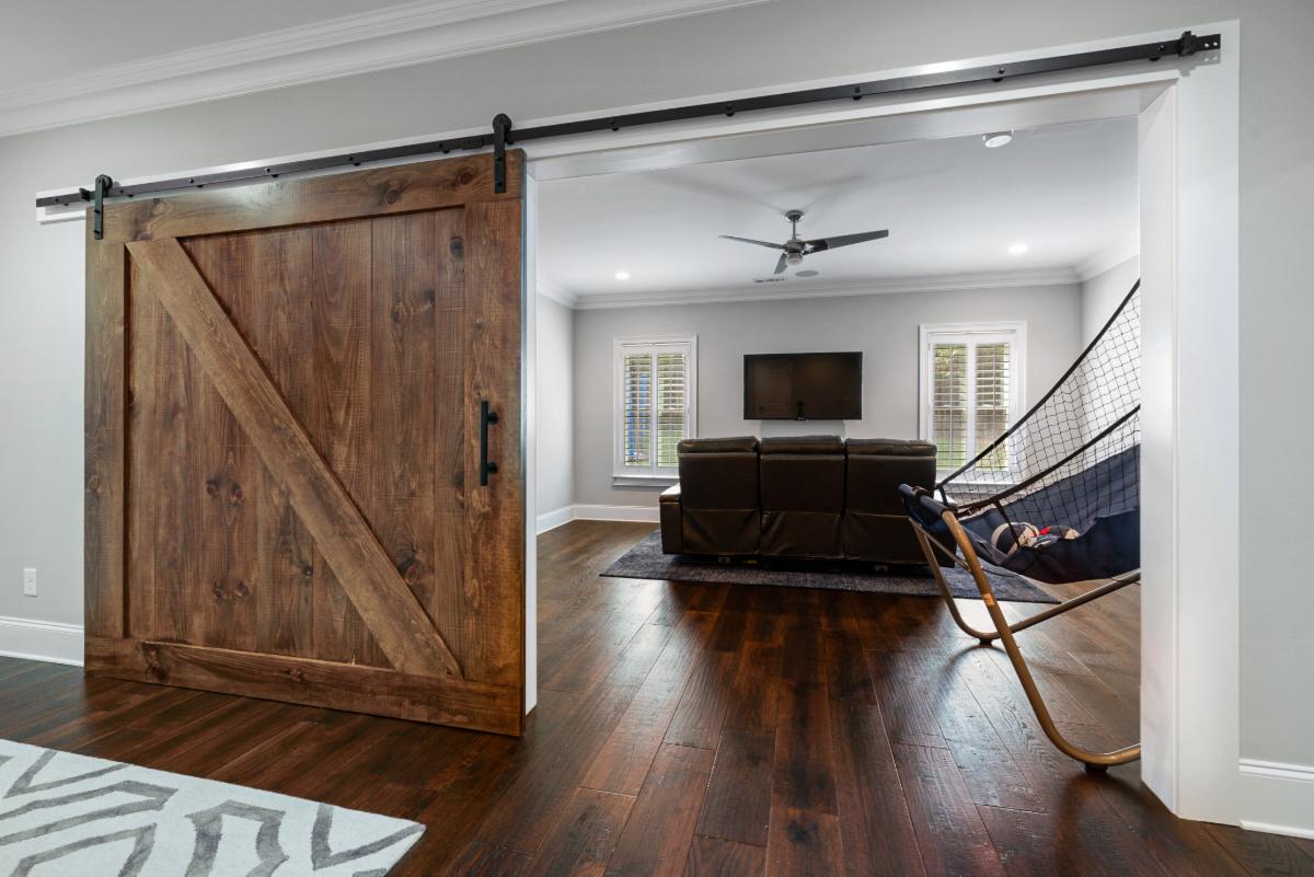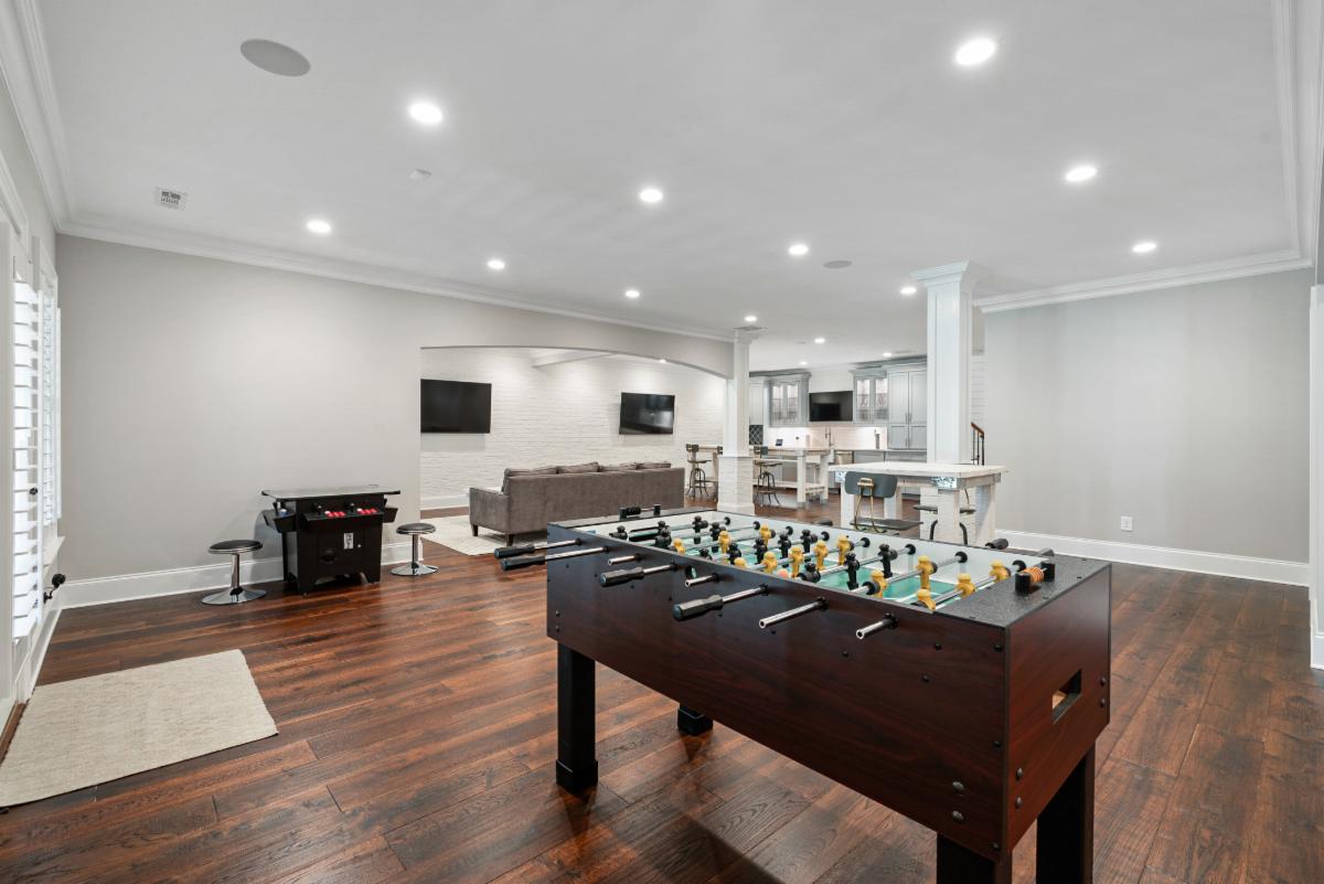 This featured basement renovation was built for a family in Marietta, Georgia. With over 2000 ft.² of space to work with and a request from the family to create an open floor plan, we engaged our engineer to specify beams that we would install to remove four load bearing walls creating a more open floor plan. Thin brick was installed on the walls of the main entertainment area and was painted white to create a fresh and spacious feel. A wet bar area was built including a beverage cooler, wine cooler, ice maker and dishwasher. We also custom built a rustic 8 foot wide barn door that would create a “flex” room that is currently used as a kids game room but could be used as a bedroom in the future. The large barn door allows it to keep the room feeling connected with the rest of the basement when open or provides privacy when used as a bedroom. A powder room was constructed with shiplap paneling and quartz countertops . Surround sound throughout and several TVs make it the perfect environment for entertaining and and spending time with family.