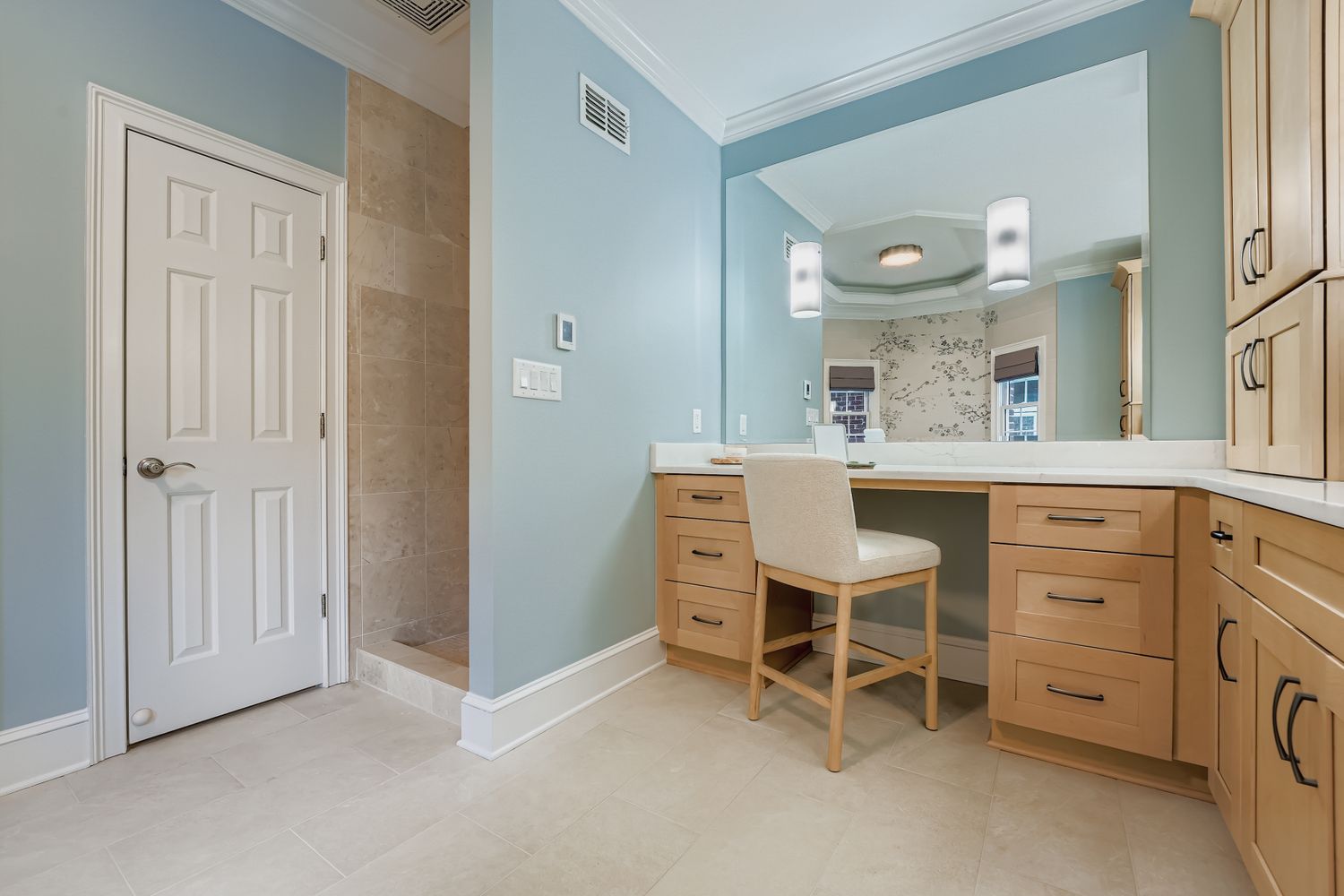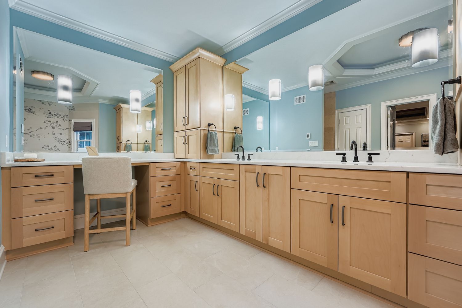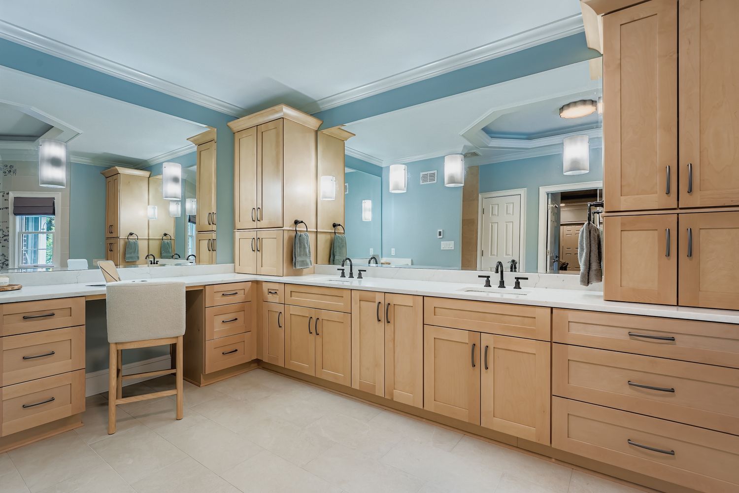 New cabinetry was installed featuring pre-fabricated Birch cabinet boxes and Maple shaker-style hardwood doors. With abundant drawers, tall storage towers, and a dedicated vanity seating area, the layout balances beauty and utility. Cabinetry hardware was upgraded with sleek pulls, while quartz countertops were chosen for their clean look, durability, and timeless appeal.