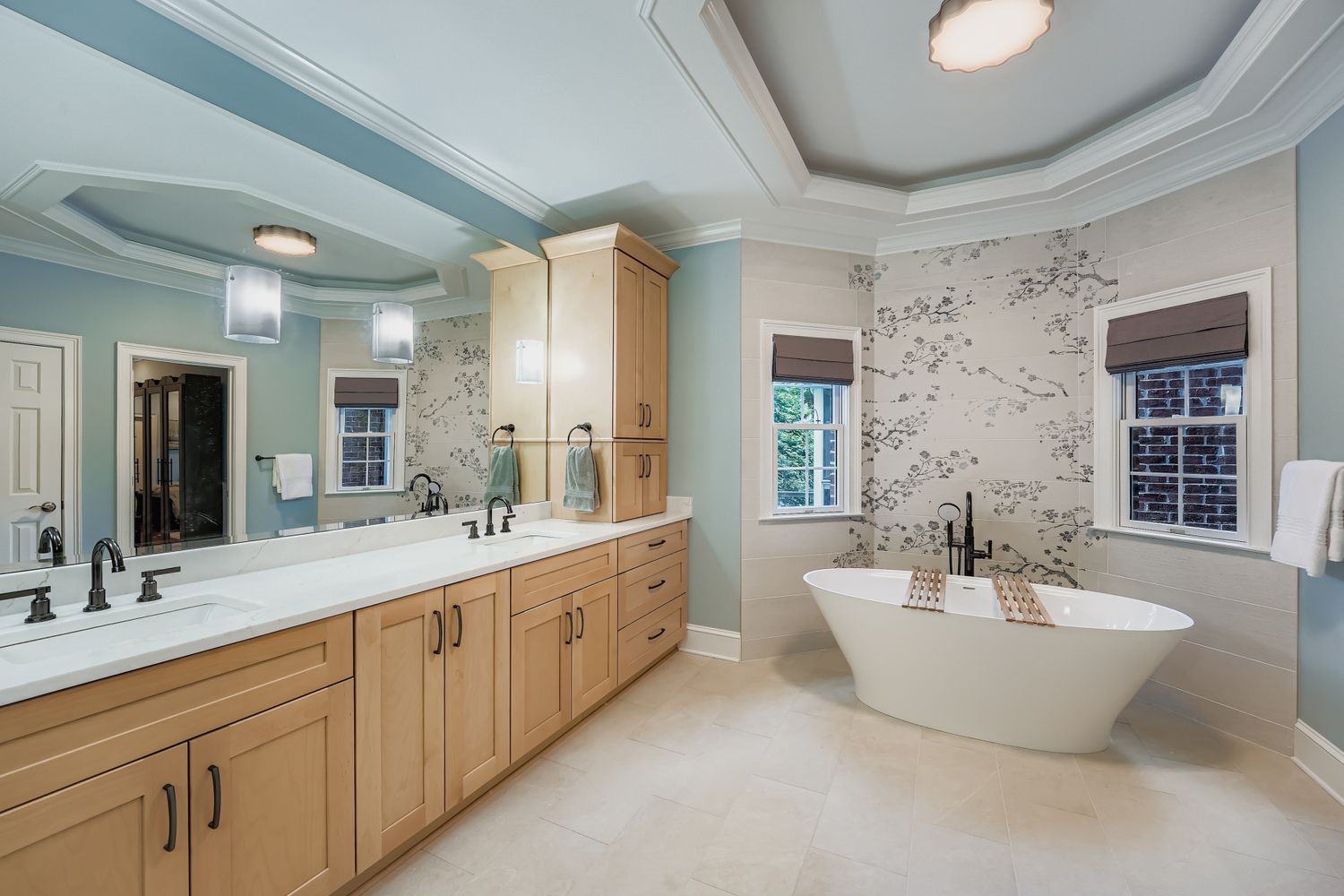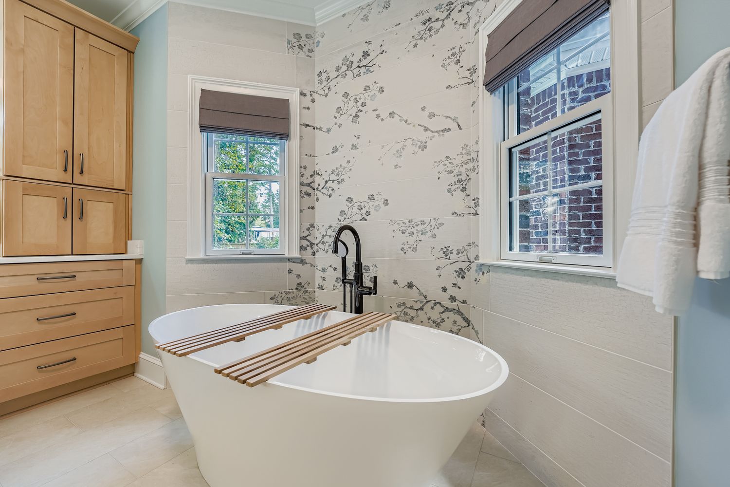 A freestanding soaking tub now commands attention beneath two bright windows. This sculptural tub is paired with a dramatic matte black freestanding filler, elevating the space with modern elegance. Double undermount porcelain sinks were installed into the vanities, each fitted with upgraded faucets.