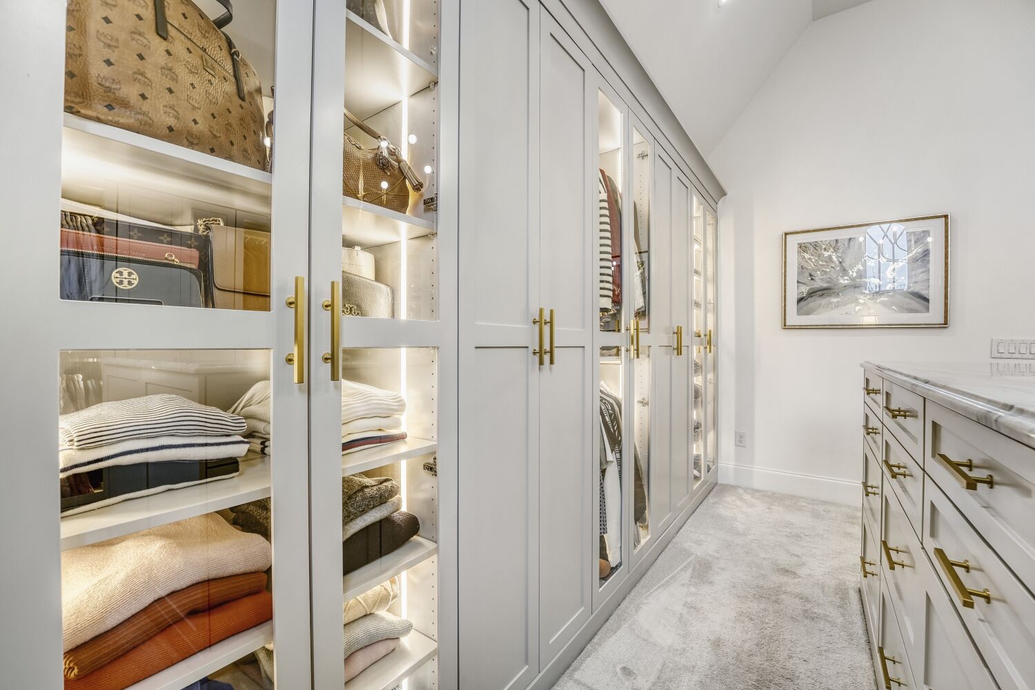 Layered lighting transforms the closet into a bright and inviting space. LED strip lighting within cabinetry provides elegant illumination for display areas, while recessed lighting and a statement decorative fixture enhance overall brightness and ambiance. New electrical controls allow convenient operation of lighting zones, improving both functionality and energy efficiency.