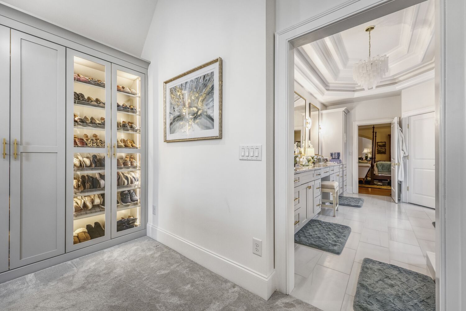 The flooring was upgraded with plush carpet and premium memory-foam padding, adding comfort underfoot and a luxurious feel throughout the space. The neutral tones complement the cabinetry and quartz surfaces, creating a cohesive and harmonious design.