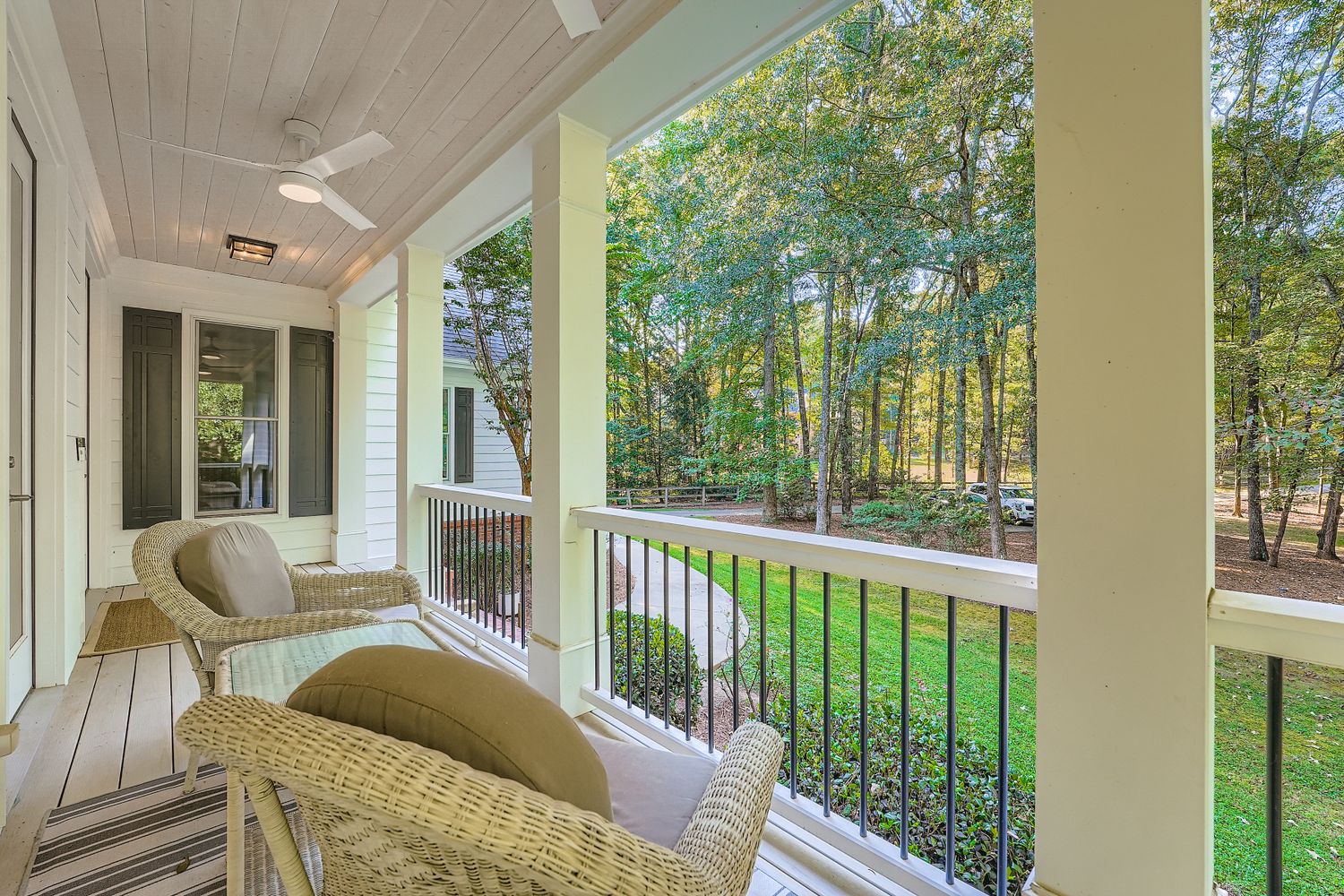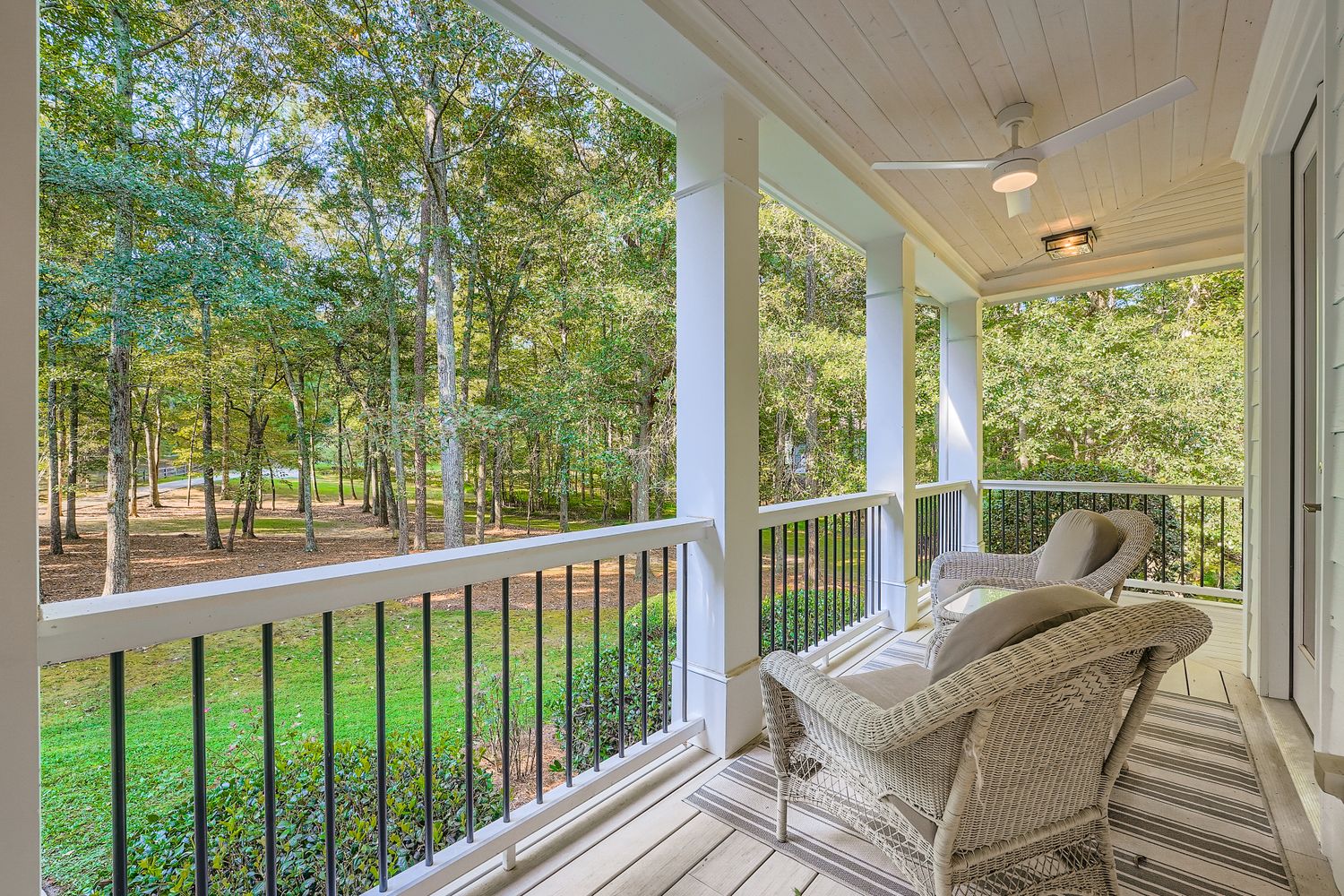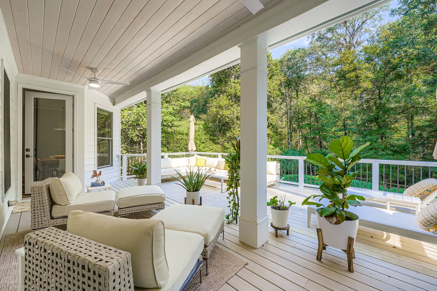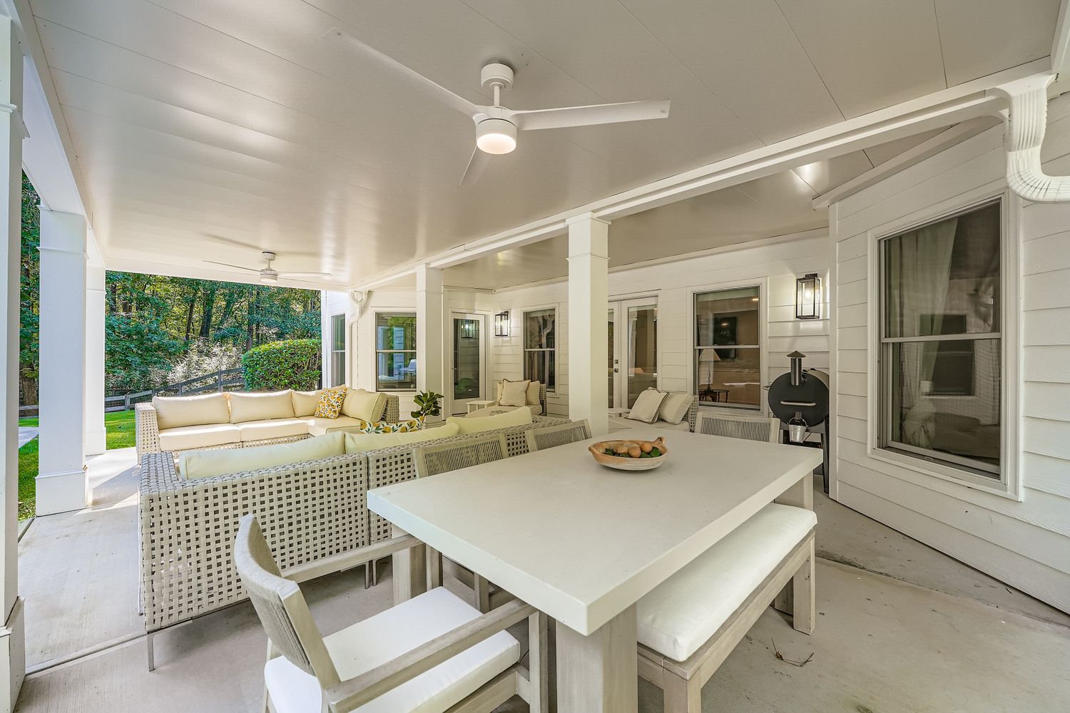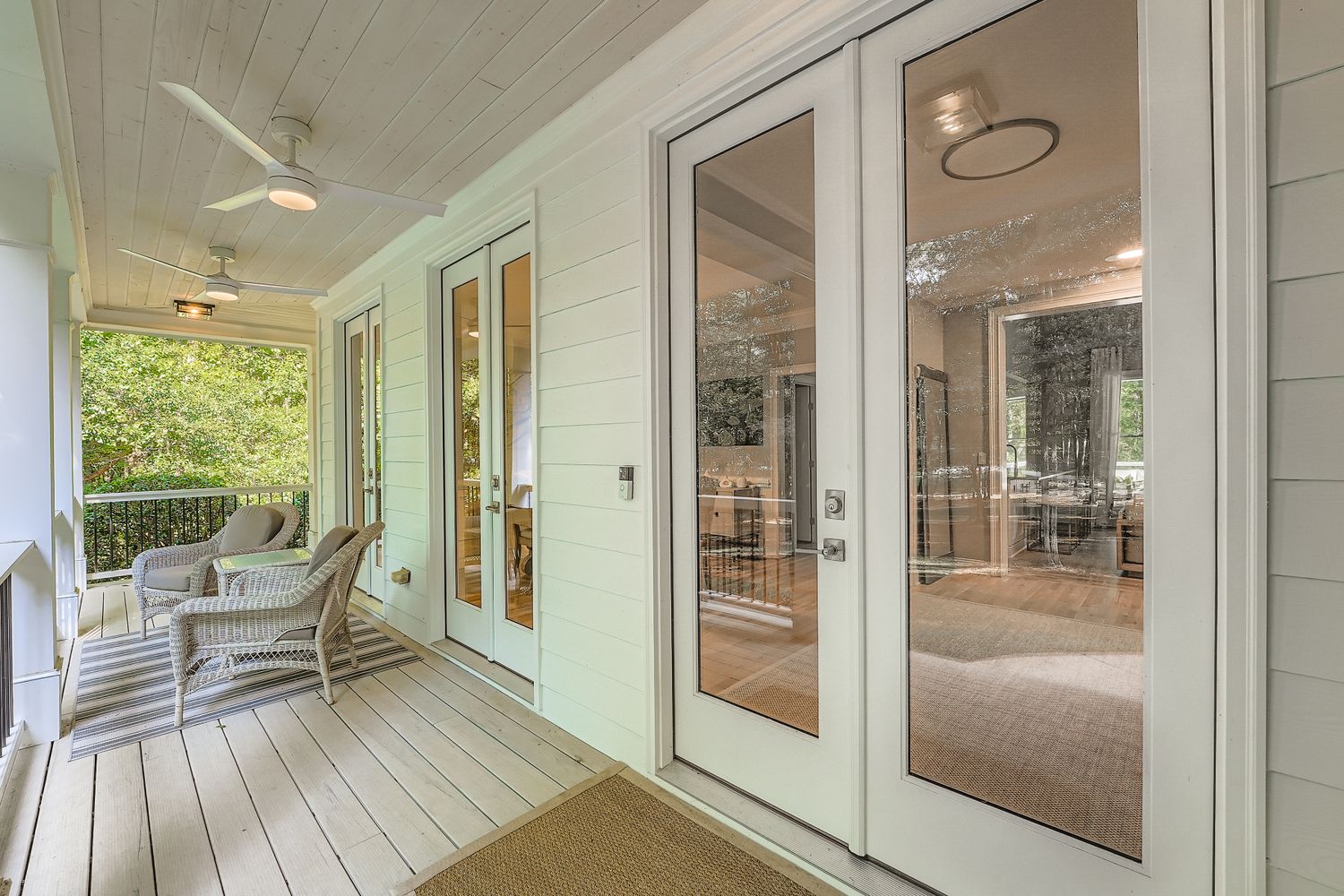 Two sleek ceiling fans circulate air, keeping the porch comfortable during warm Georgia summers. A fresh coat of Sherwin-Williams Pure White ties together the trim and columns for a crisp, timeless finish. New double-entry doors with decorative glass inserts add sophistication while allowing natural light to flow into the home’s interior.