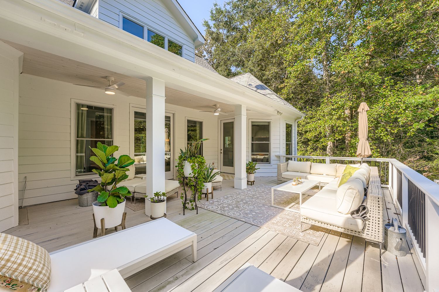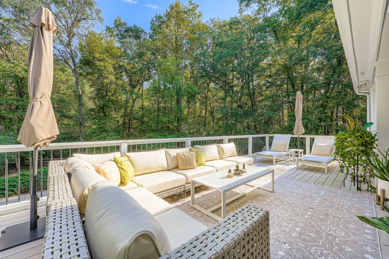 The covered sections feature a tongue-and-groove ceiling finished in a rich Dark Walnut stain, adding depth, warmth, and an intimate feel to the space. French doors, painted in Sherwin-Williams Stone Hearth, connect the interior seamlessly with the outdoor deck. Furnished with a plush sectional sofa, lounge chairs, bold-patterned rugs, and potted greenery, the deck now feels like a stylish extension of the home’s living area.