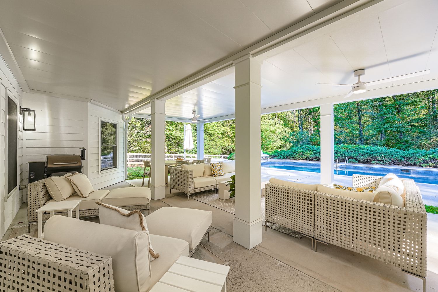 Crisp Sherwin-Williams Pure White trim defines the columns and framing, while durable outdoor furnishings complete the look. Whether for poolside lounging, shaded grilling, or cozy evening entertaining, this patio delivers year-round functionality with a refined, polished aesthetic.