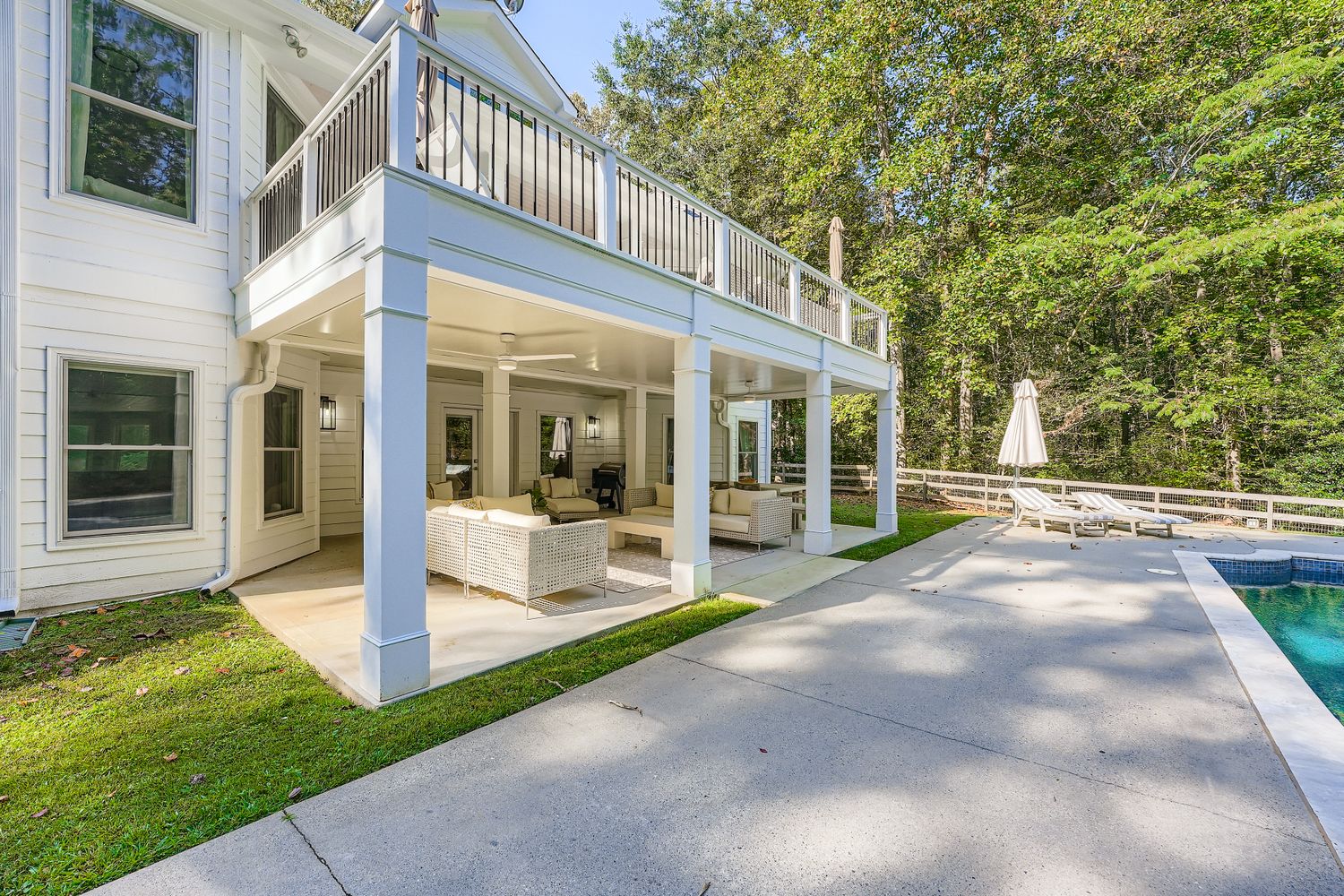 Directly beneath the deck, the covered patio offers a resort-worthy gathering space. Its beadboard ceiling painted in Sherwin-Williams Alabaster is accented with recessed lighting and ceiling fans, ensuring both comfort and function. The flooring was designed with slip-resistant finishes to make it safe and family-friendly for its poolside setting.