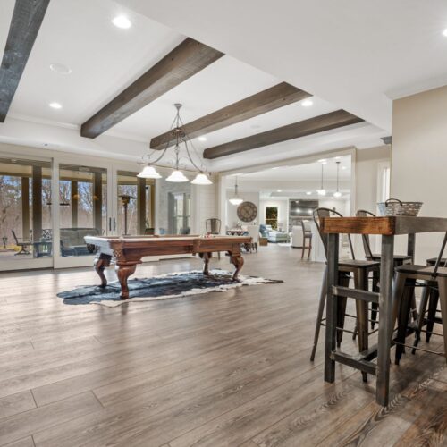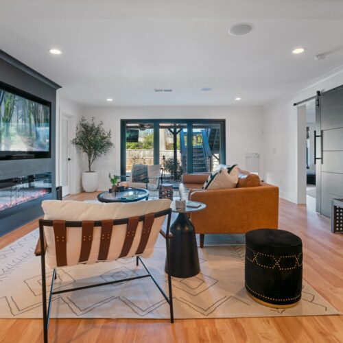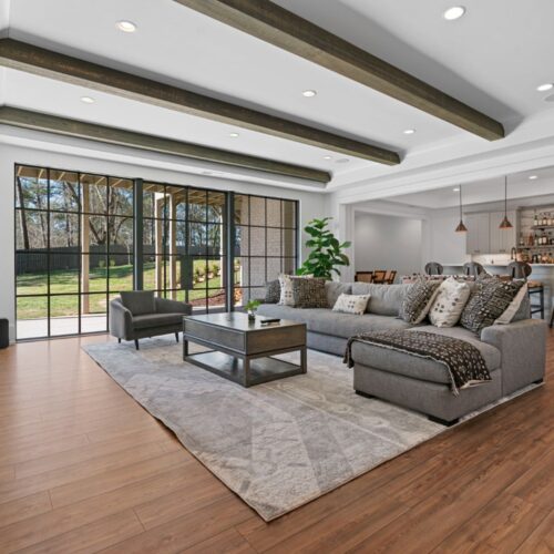 Spacious living room with light wood flooring, a large gray sectional sofa, and two matching armchairs surrounding a wooden coffee table. The room features exposed wooden ceiling beams, a wall-mounted TV above a modern fireplace, and built-in shelves. General Contractor and Home Remodeler serving Atlanta, Alpharetta, Marietta, Decatur, Cumming, Johns Creek