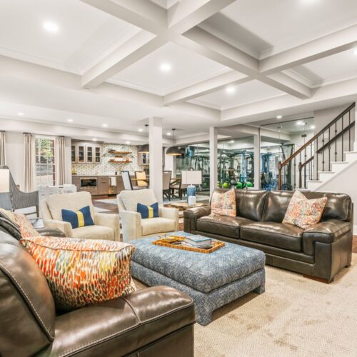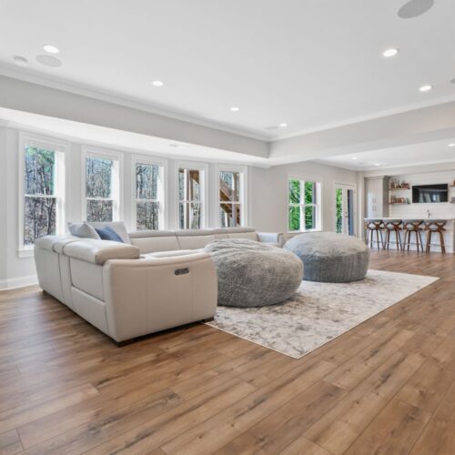 A spacious living room with gray walls, recessed lighting, and wooden flooring exemplifies the elegance of a Roswell Basement Remodel Tremble. It features brown leather sofas, a large area rug, a small table, and a built-in shelving unit with decorative items along a brick accent wall. Tall windows let in natural light. General Contractor and Home Remodeler serving Atlanta, Alpharetta, Marietta, Milton, Decatur, Cumming, Johns Creek, Dunwoody, Sandy Springs, and Roswell