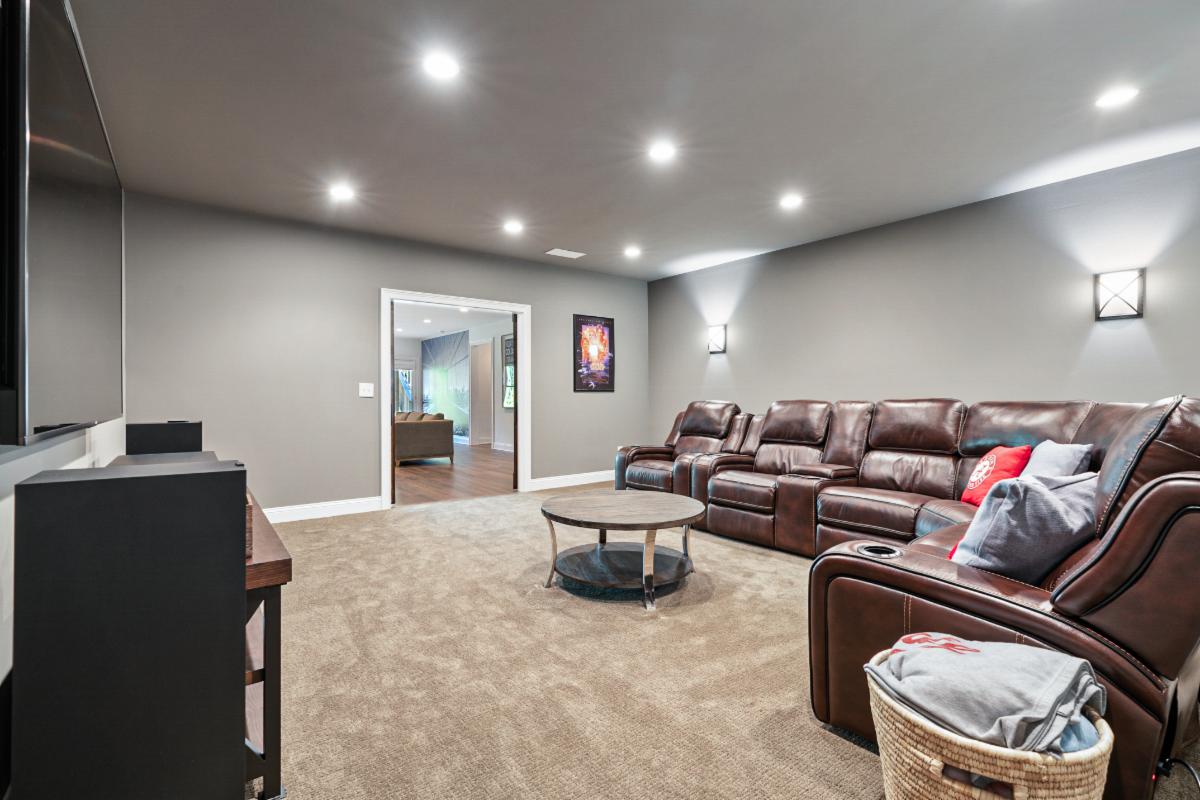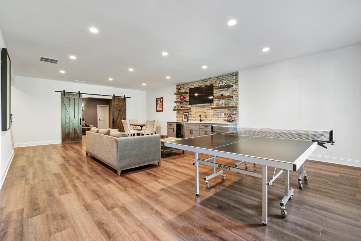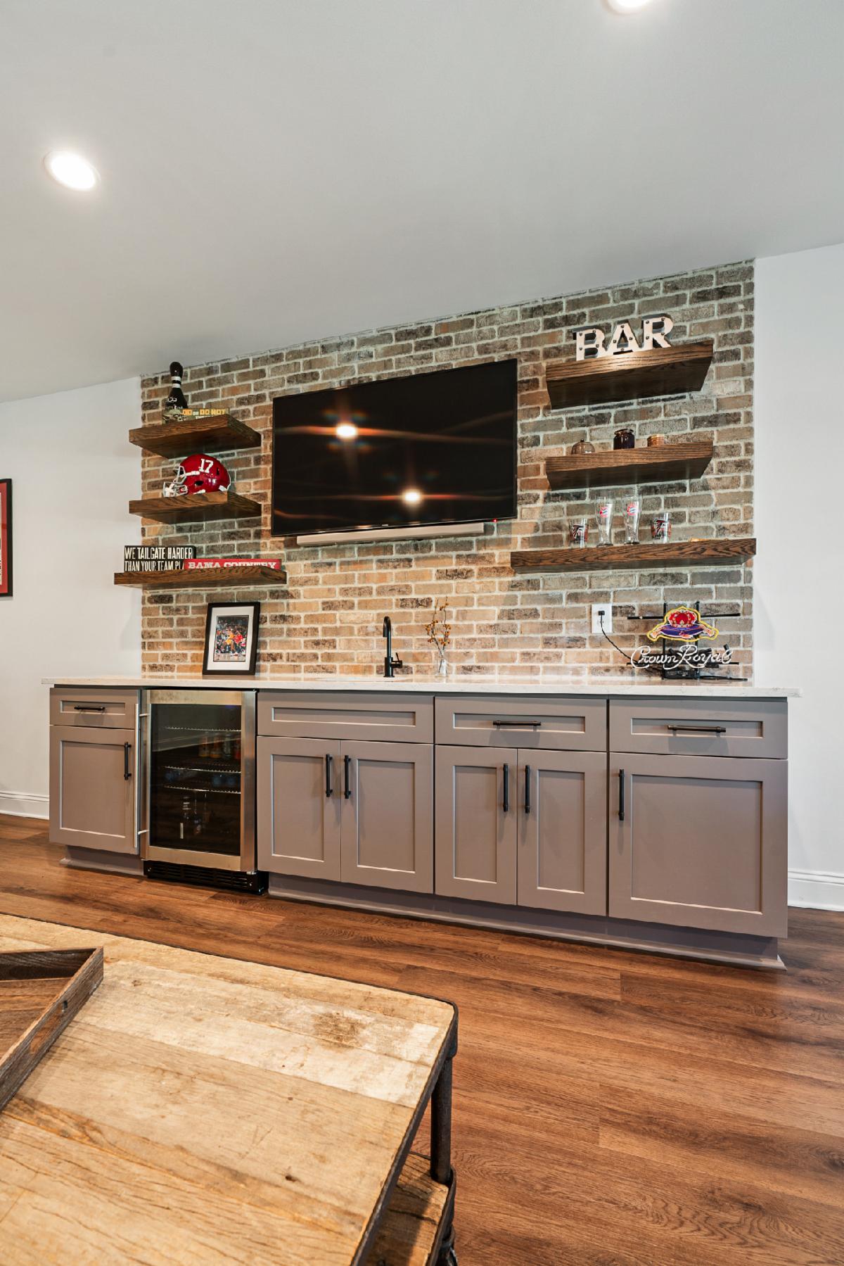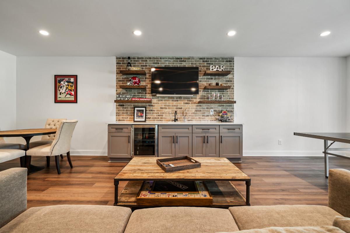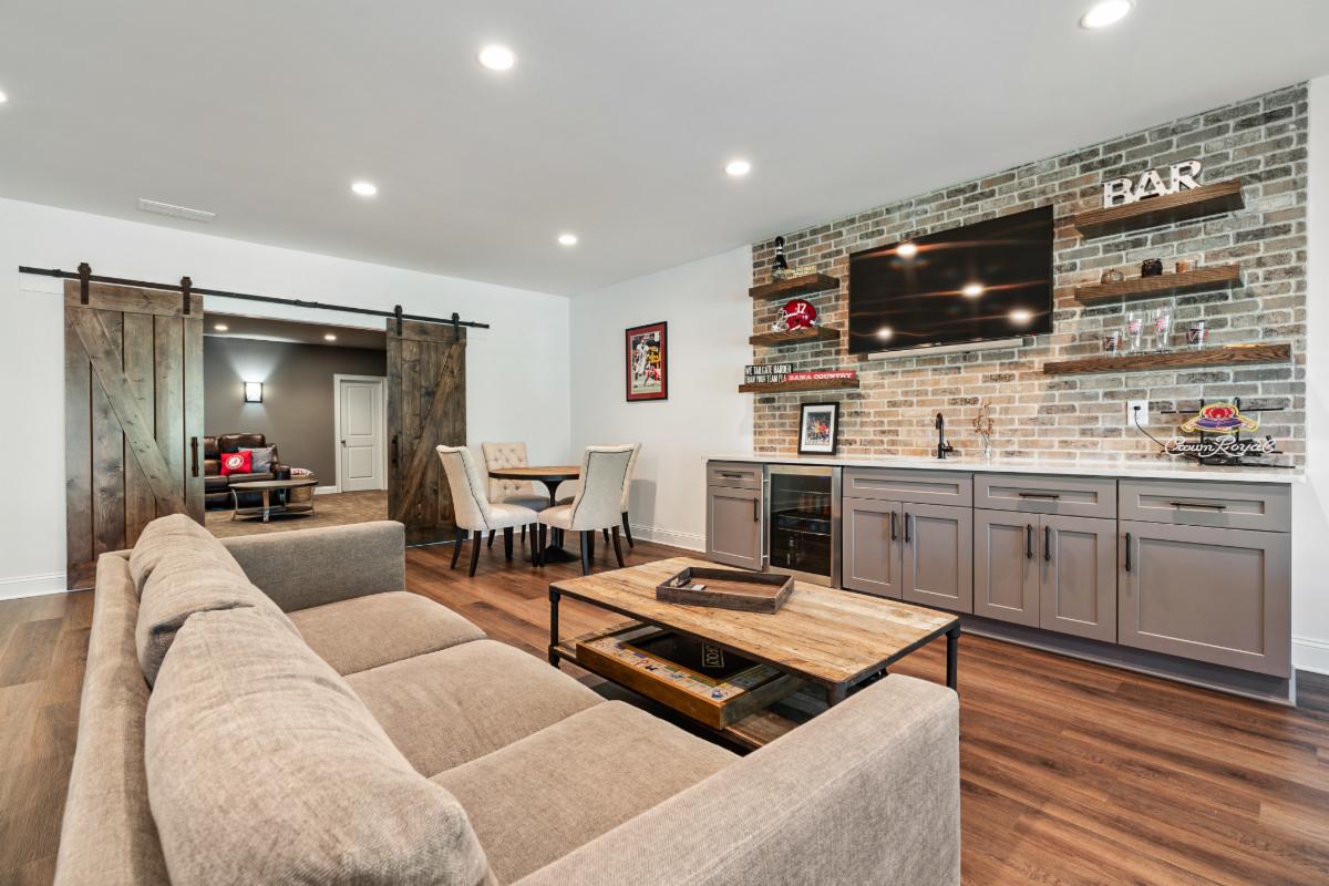 Our latest basement creation was designed and constructed for our clients in Sandy Springs, Ga. It featured a bar with brick back splash, floating shelves, and Quartz counter tops. The flooring used for this project was a Luxury Vinyl Plank flooring that is moisture and scratch resistant which makes it ideal for basements. A media/ family room was included in the design with custom stained barn doors to close the room from natural light. Sconce lights on the interior walls complemented the media room theme and were functional for low mood lighting. The tub/shower combo was finished with a tumbled marble tile and a Bi Pass shower door. We think the Quartz counter tops and LVP flooring finished the space nicely! If you, a friend or neighbor are in the market for a Basement, Kitchen, Addition, or Bathroom remodel give us a call to chat. We would love to earn your business and provide you with outstanding service and a quality job.