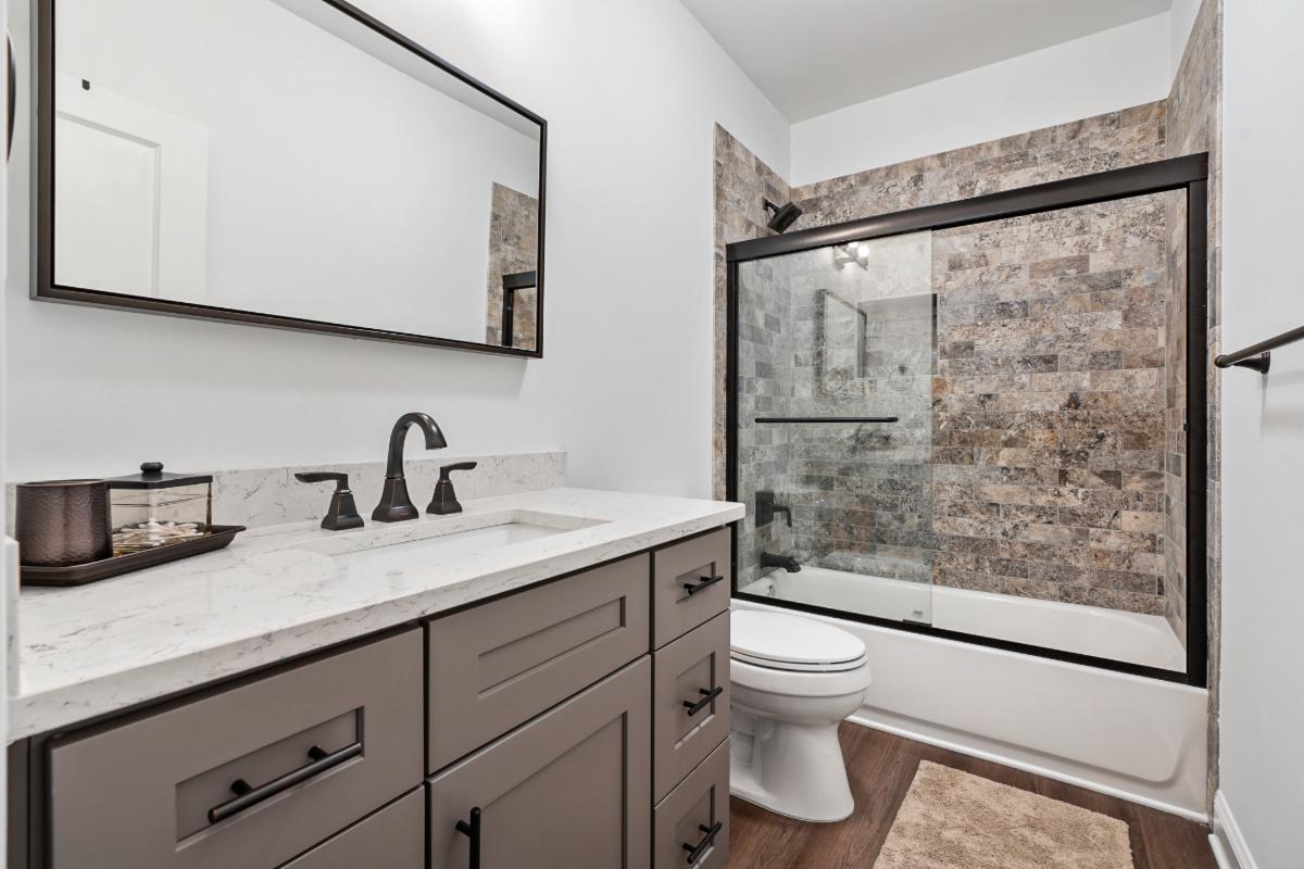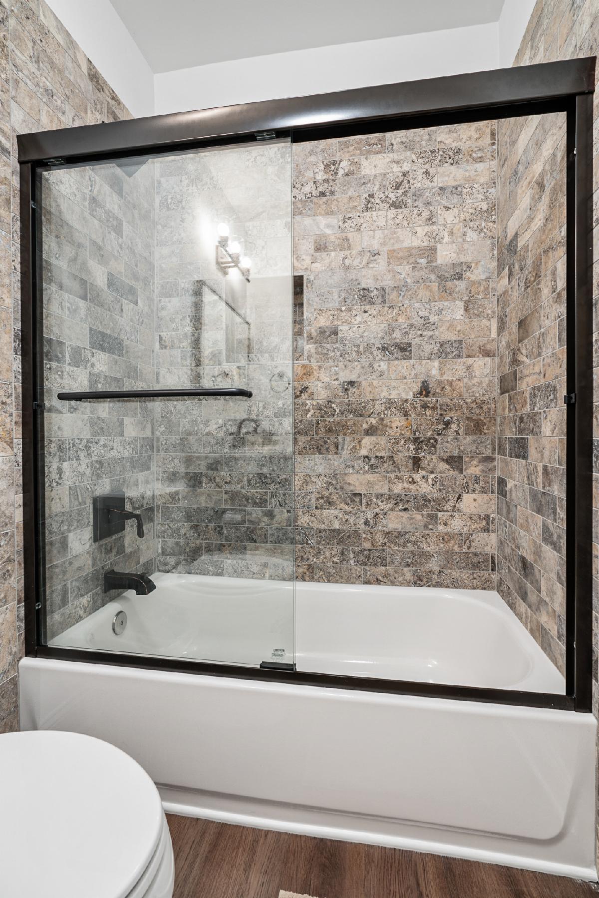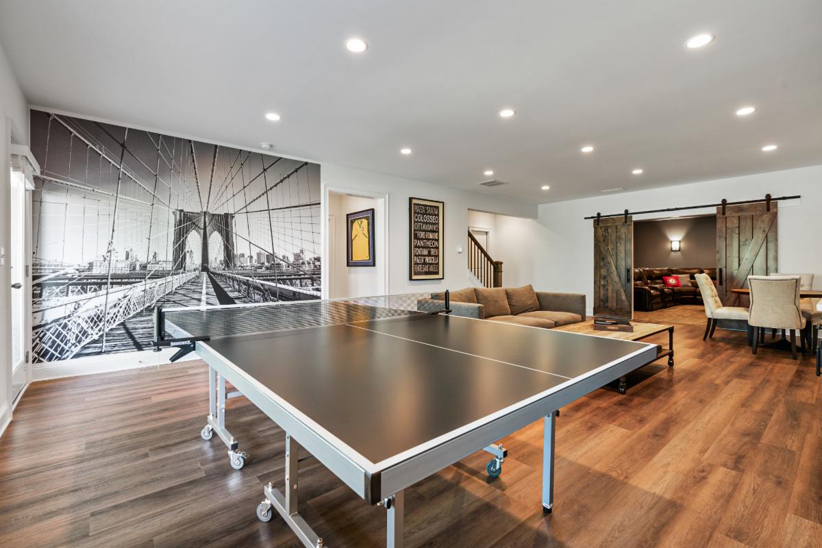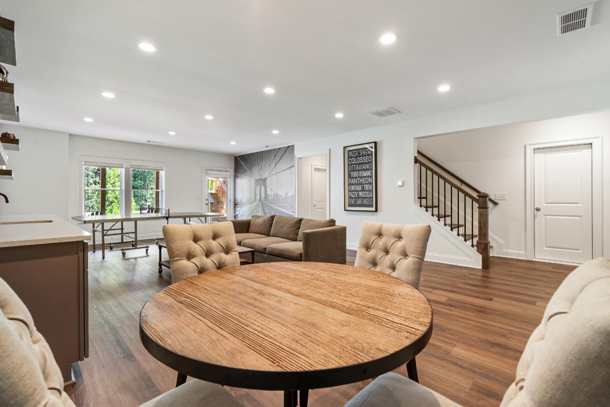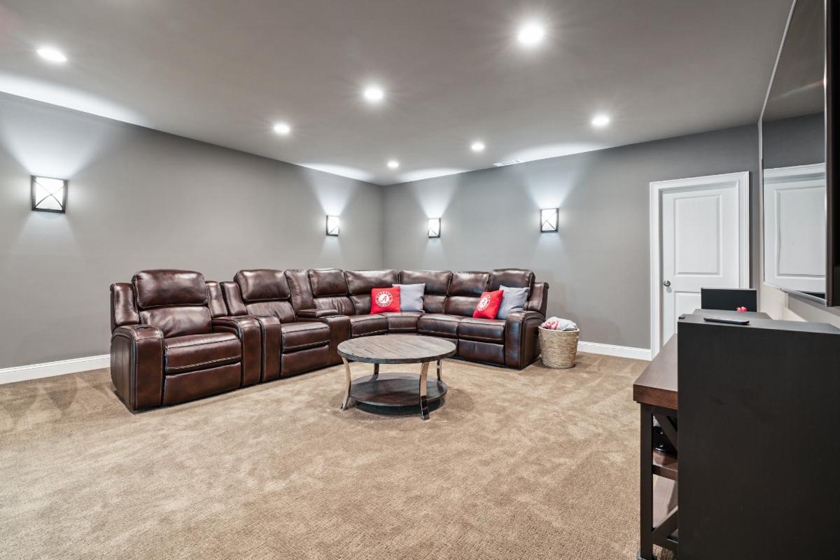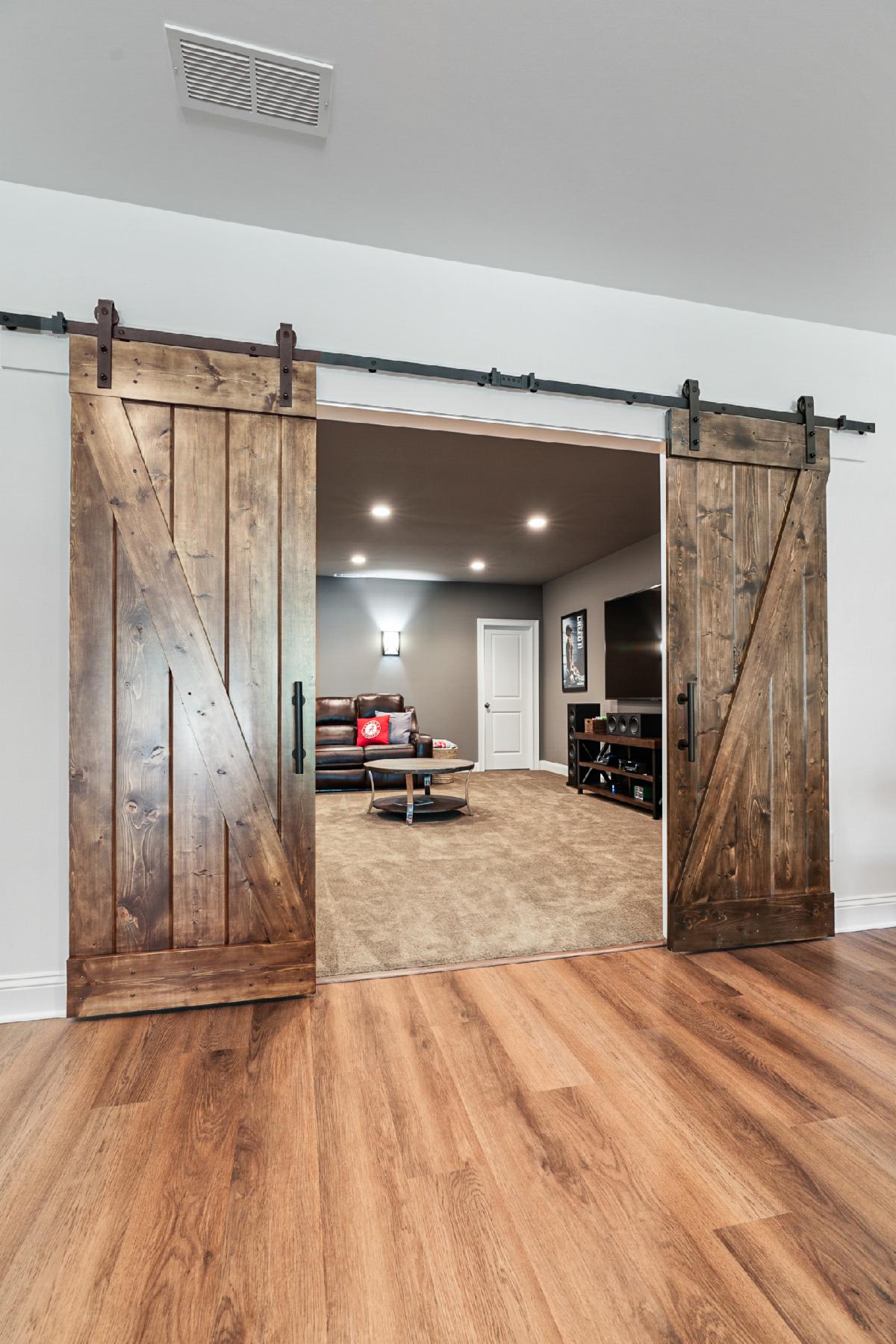 Our latest basement creation was designed and constructed for our clients in Sandy Springs, Ga. It featured a bar with brick back splash, floating shelves, and Quartz counter tops. The flooring used for this project was a Luxury Vinyl Plank flooring that is moisture and scratch resistant which makes it ideal for basements. A media/ family room was included in the design with custom stained barn doors to close the room from natural light. Sconce lights on the interior walls complemented the media room theme and were functional for low mood lighting. The tub/shower combo was finished with a tumbled marble tile and a Bi Pass shower door. We think the Quartz counter tops and LVP flooring finished the space nicely! If you, a friend or neighbor are in the market for a Basement, Kitchen, Addition, or Bathroom remodel give us a call to chat. We would love to earn your business and provide you with outstanding service and a quality job.